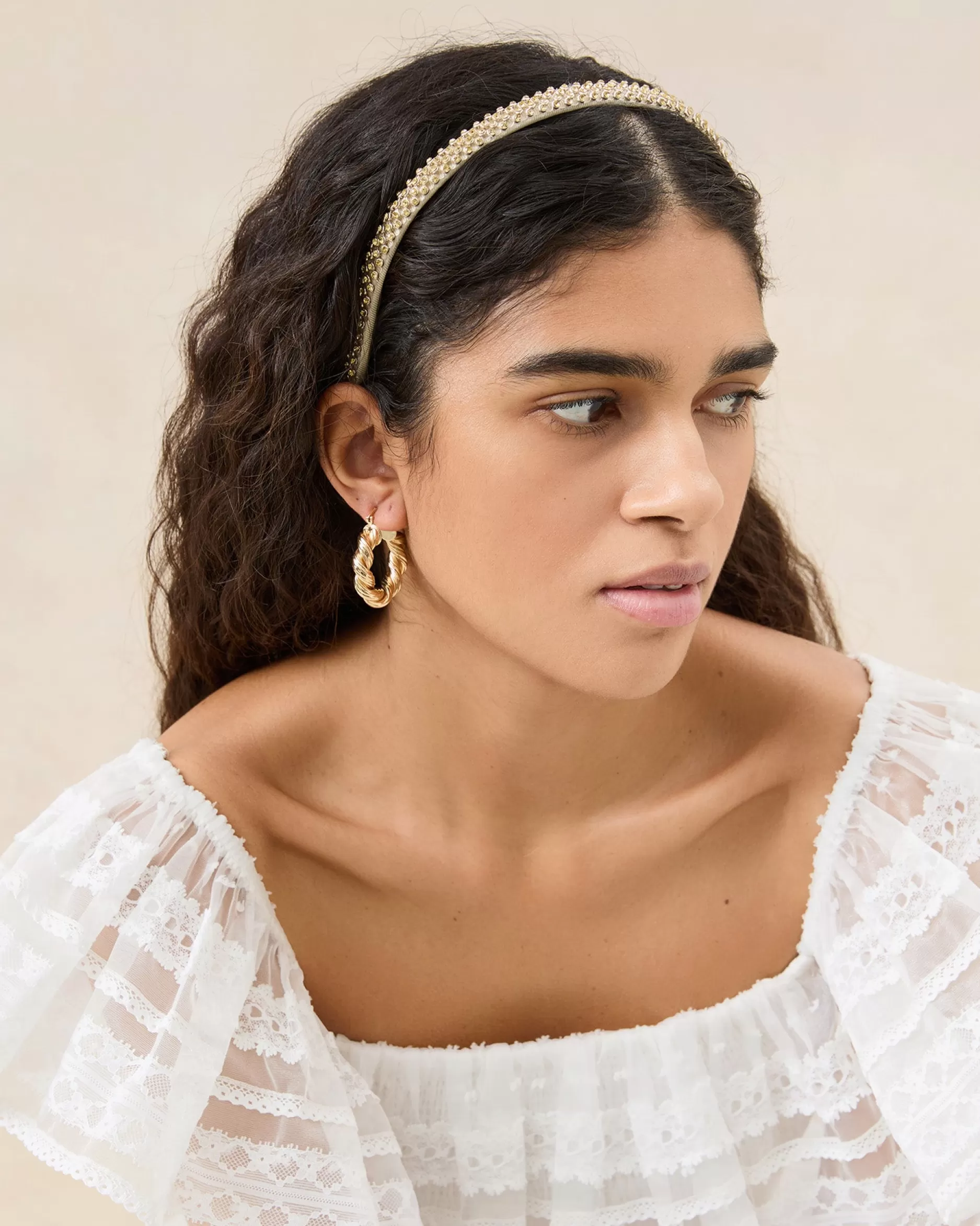 Welcome to Loeffler Randall. Discover our collection of beautiful, handcrafted styles from shoes to RTW to accessories. |Set of two thin headbands in gold and hay cotton fabric topped with gold diamanté.|It is recommended to avoid contact with abrasive materials and rough surfaces. Store in a dust bag out of direct sunlight when not in use.|Set of two thin headbands in gold and hay cotton fabric topped with gold diamanté.