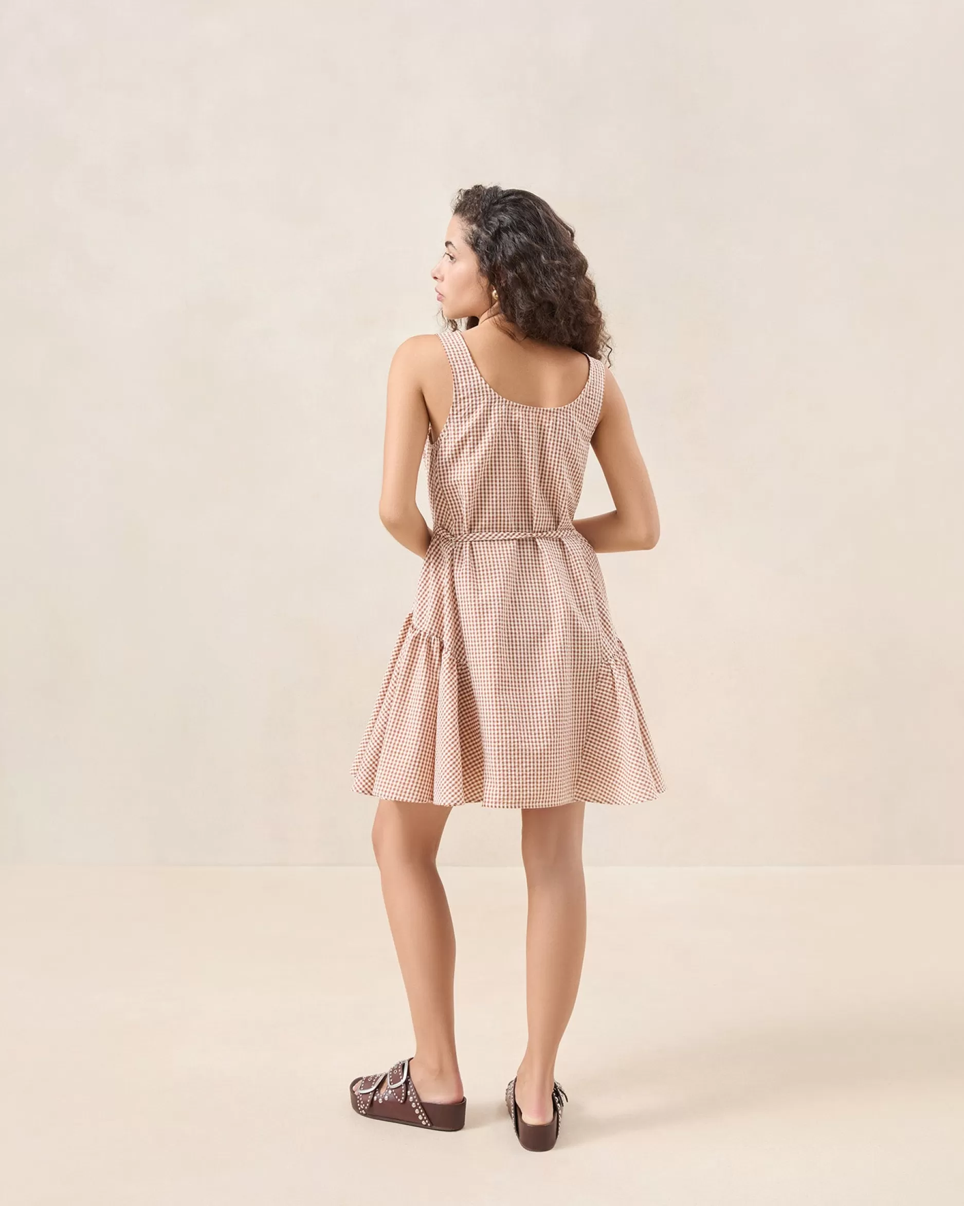 Welcome to Loeffler Randall. Discover our collection of beautiful, handcrafted styles from shoes to RTW to accessories. |Sleeveless dress in brown gingham. Avi features flounces along the sides for extra volume, a removable fabric belt, and a seersucker texture. Hits a few inches above the knee.|Dry clean only.|Sleeveless dress in brown gingham. Avi features flounces along the sides for extra volume, a removable fabric belt, and a seersucker texture. Hits a few inches above the knee. SizeXSSMLXLShoulder11"11.5"12"12.5"13"Bust35.5"37.5"39.5"41.5"43.5"Waist45.5"47.5"49.5"51.5"53.5"Hip57"59"61"63"65"Length34.5"35"35.5"36"36.5"
