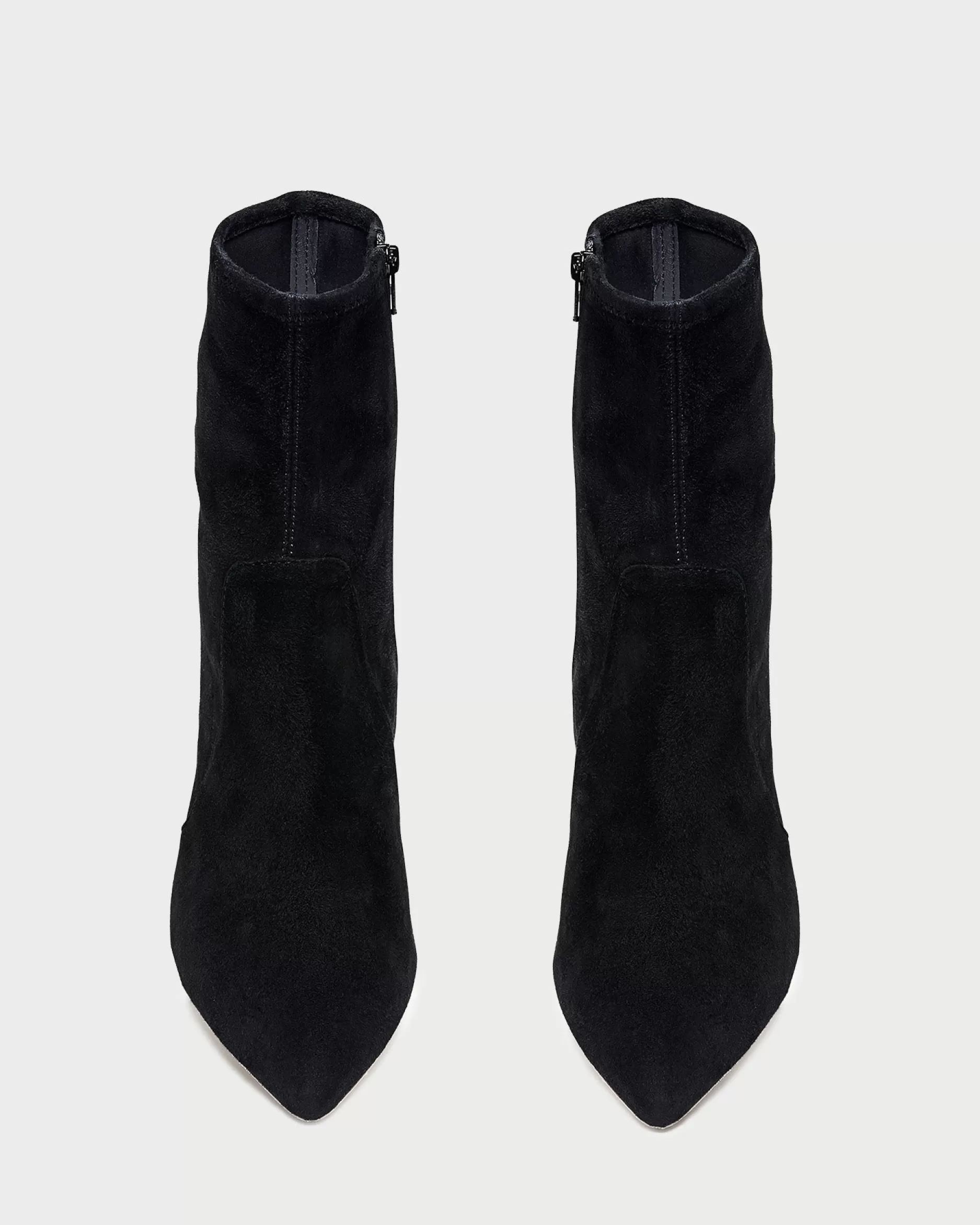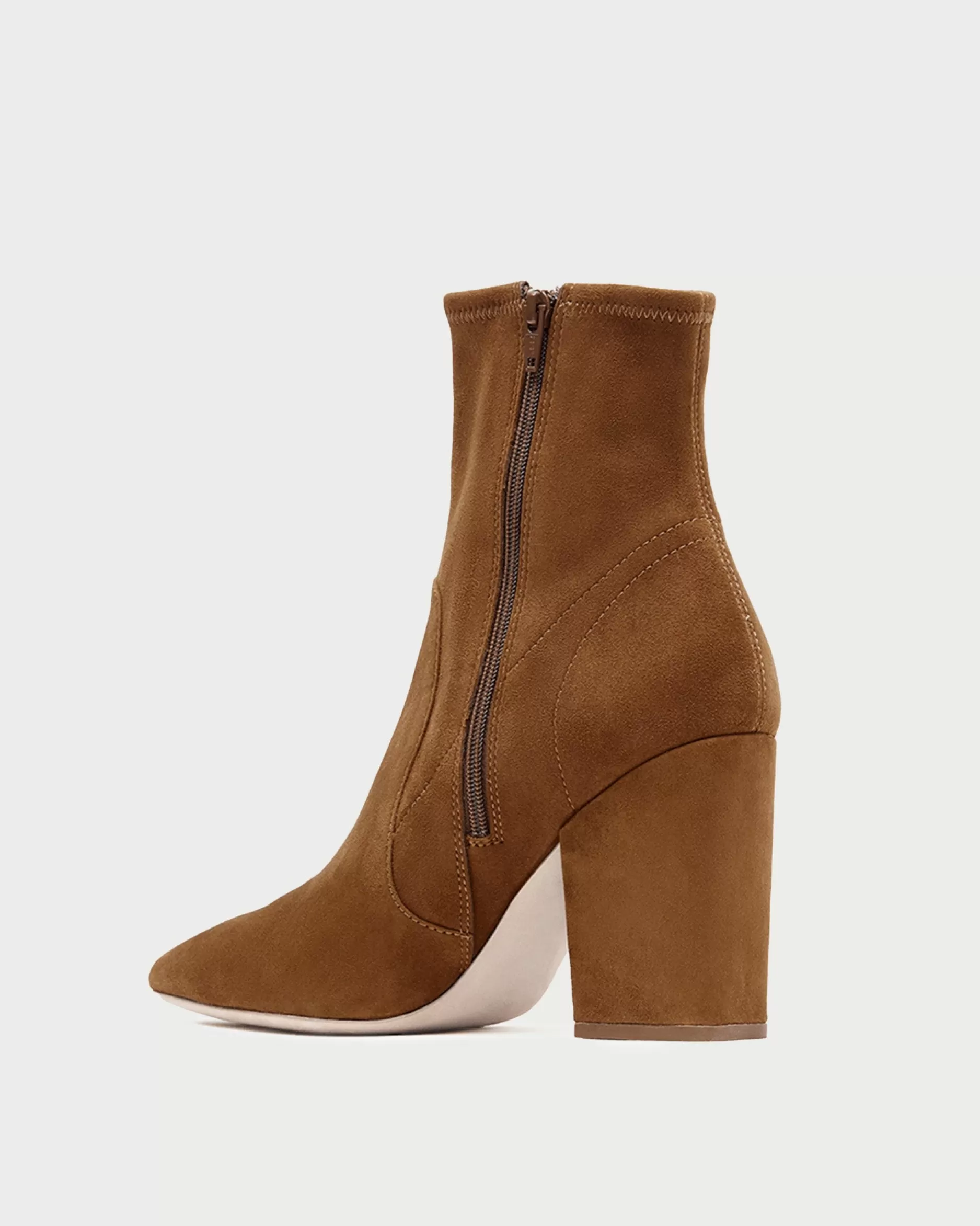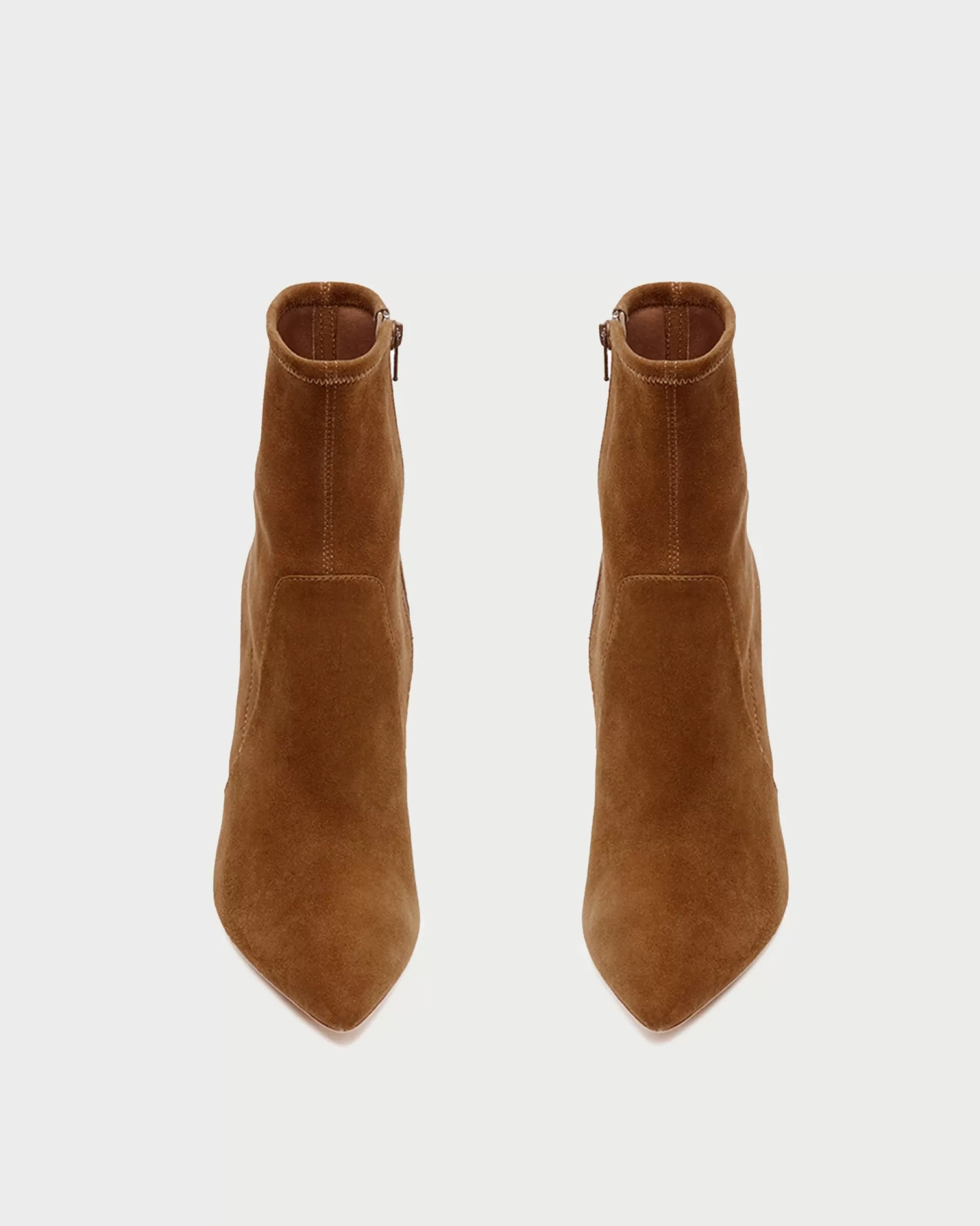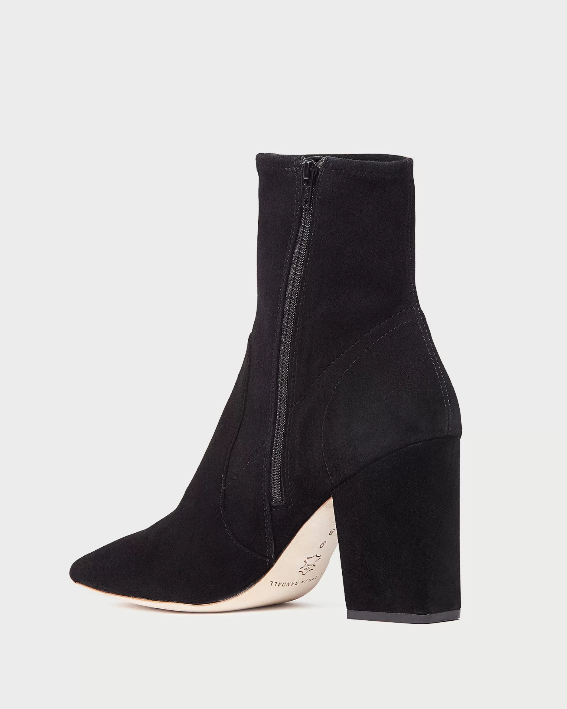 Welcome to Loeffler Randall. Discover our collection of beautiful, handcrafted styles from shoes to RTW to accessories. |u003cpu003eHigh heel ankle bootie with pointed toe in cacao brown stretch suede. Padded footbed with gold stamped logo. Side zipper. 3.5 inch heel.u003c/pu003e|Suede is delicate and should be kept away from water and stored properly in order to avoid matting. Suede fibers can be restored with a suede sponge/brush.|u003cpu003eHigh heel ankle bootie with pointed toe in black stretch suede. Padded footbed with gold stamped logo. Side zipper. 3.5 inch heel.u003c/pu003e|Suede is delicate and should be kept away from water and stored properly in order to avoid matting. Suede fibers can be restored with a suede sponge/brush.|High heel ankle bootie with pointed toe in cacao brown stretch suede. Padded footbed with gold stamped logo. Side zipper. 3.5 inch heel.