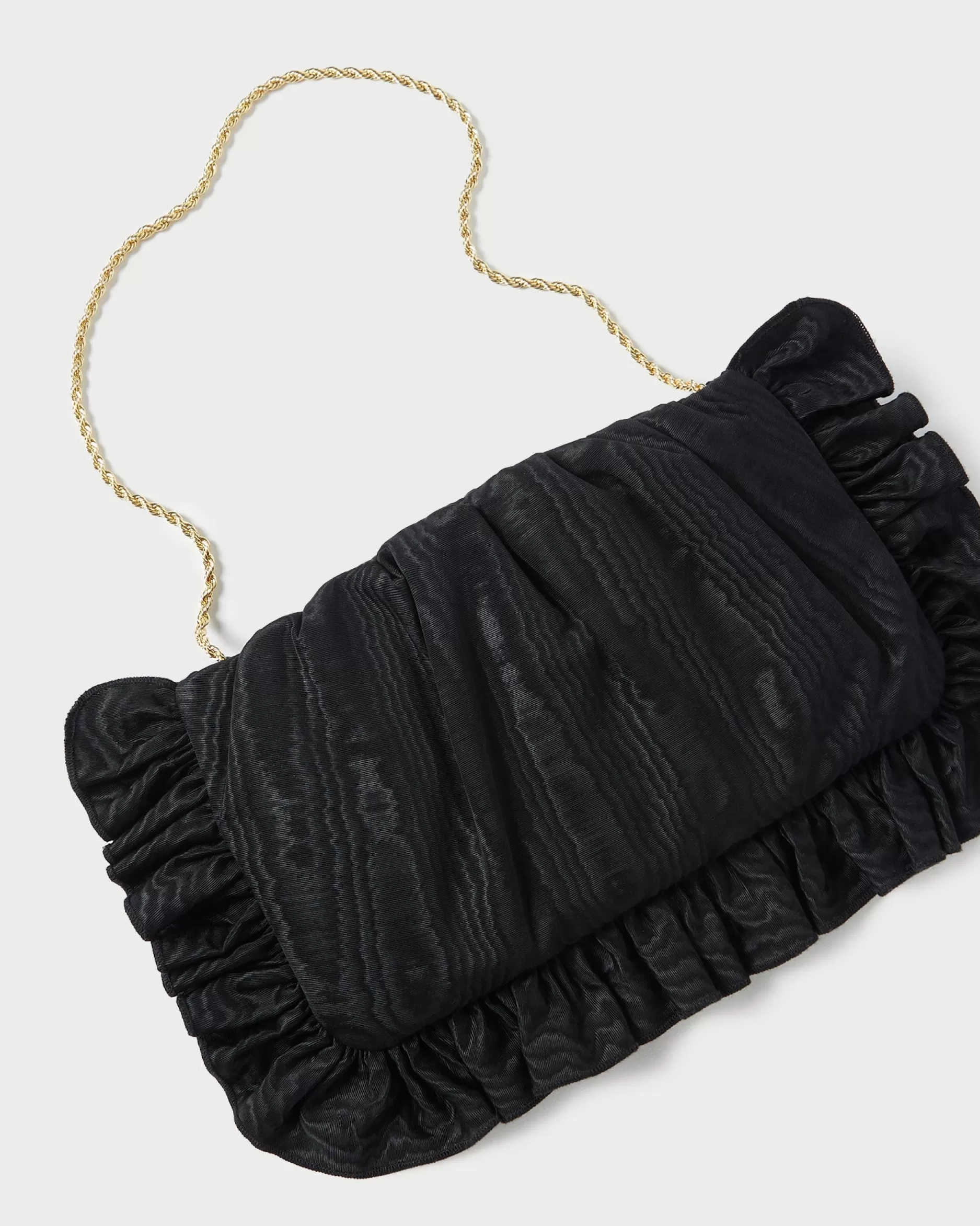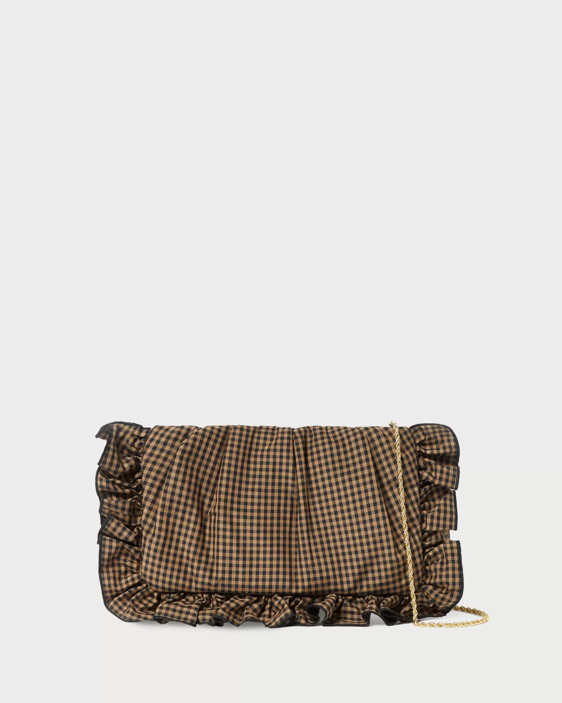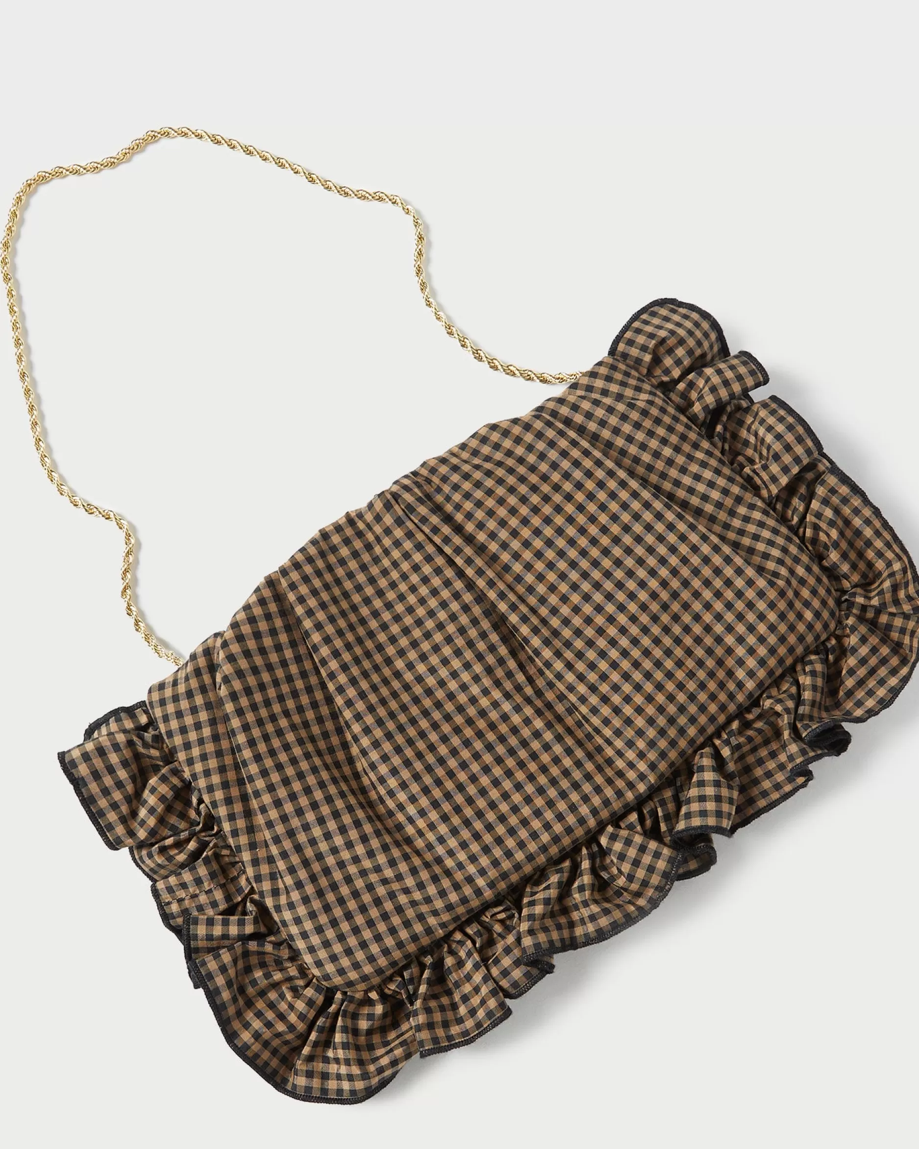 Welcome to Loeffler Randall. Discover our collection of beautiful, handcrafted styles from shoes to RTW to accessories. |Clutch in vanilla moiré with ruffle detailing. Features a removable twisted gold chain strap, frame closure, and interior card slot.|Italian moiré fabric is delicate and subject to pulls in thread with contact to abrasive materials. Wear with care.|Clutch in black and brown checked taffeta with ruffle detailing. Features a removable twisted gold chain strap, frame closure, and interior card slot.||Clutch in natural crocheted raffia with ruffle detailing. Features a removable twisted gold chain strap, frame closure, and interior card slot.|We selected this material for its exceptional quality and appearance. As with most natural materials, variations in thickness and color are to be expected. Due to the delicate nature of the fiber, normal wear may occur over time. It is recommended that raffia not be exposed to water in order to maintain its appearance.|Clutch in black moiré with ruffle detailing. Features a removable twisted gold chain strap, frame closure, and interior card slot.|Italian moiré fabric is delicate and subject to pulls in thread with contact to abrasive materials. Wear with care.|Clutch in vanilla moiré with ruffle detailing. Features a removable twisted gold chain strap, frame closure, and interior card slot.
