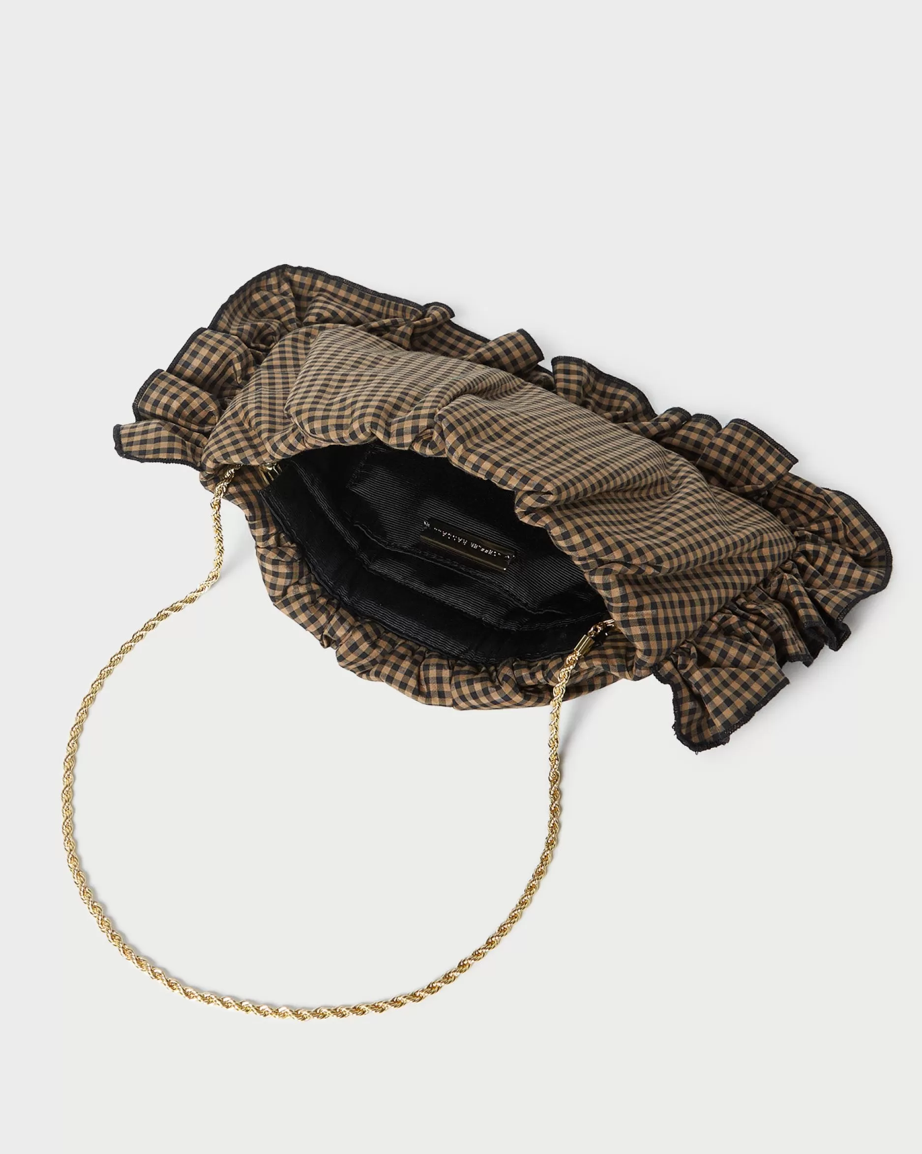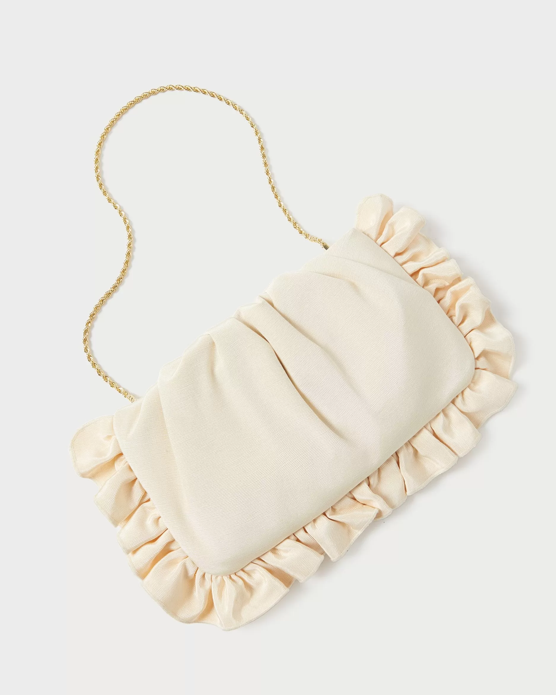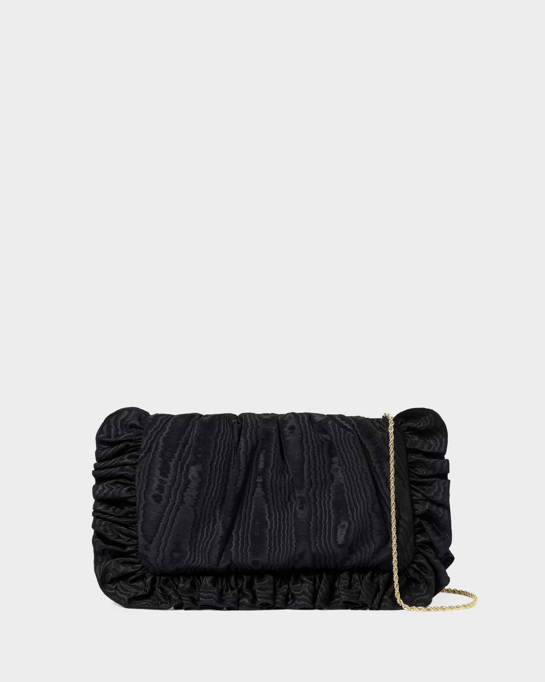 Welcome to Loeffler Randall. Discover our collection of beautiful, handcrafted styles from shoes to RTW to accessories. |Clutch in vanilla moiré with ruffle detailing. Features a removable twisted gold chain strap, frame closure, and interior card slot.|Italian moiré fabric is delicate and subject to pulls in thread with contact to abrasive materials. Wear with care.|Clutch in black and brown checked taffeta with ruffle detailing. Features a removable twisted gold chain strap, frame closure, and interior card slot.||Clutch in natural crocheted raffia with ruffle detailing. Features a removable twisted gold chain strap, frame closure, and interior card slot.|We selected this material for its exceptional quality and appearance. As with most natural materials, variations in thickness and color are to be expected. Due to the delicate nature of the fiber, normal wear may occur over time. It is recommended that raffia not be exposed to water in order to maintain its appearance.|Clutch in black moiré with ruffle detailing. Features a removable twisted gold chain strap, frame closure, and interior card slot.|Italian moiré fabric is delicate and subject to pulls in thread with contact to abrasive materials. Wear with care.|Clutch in vanilla moiré with ruffle detailing. Features a removable twisted gold chain strap, frame closure, and interior card slot.