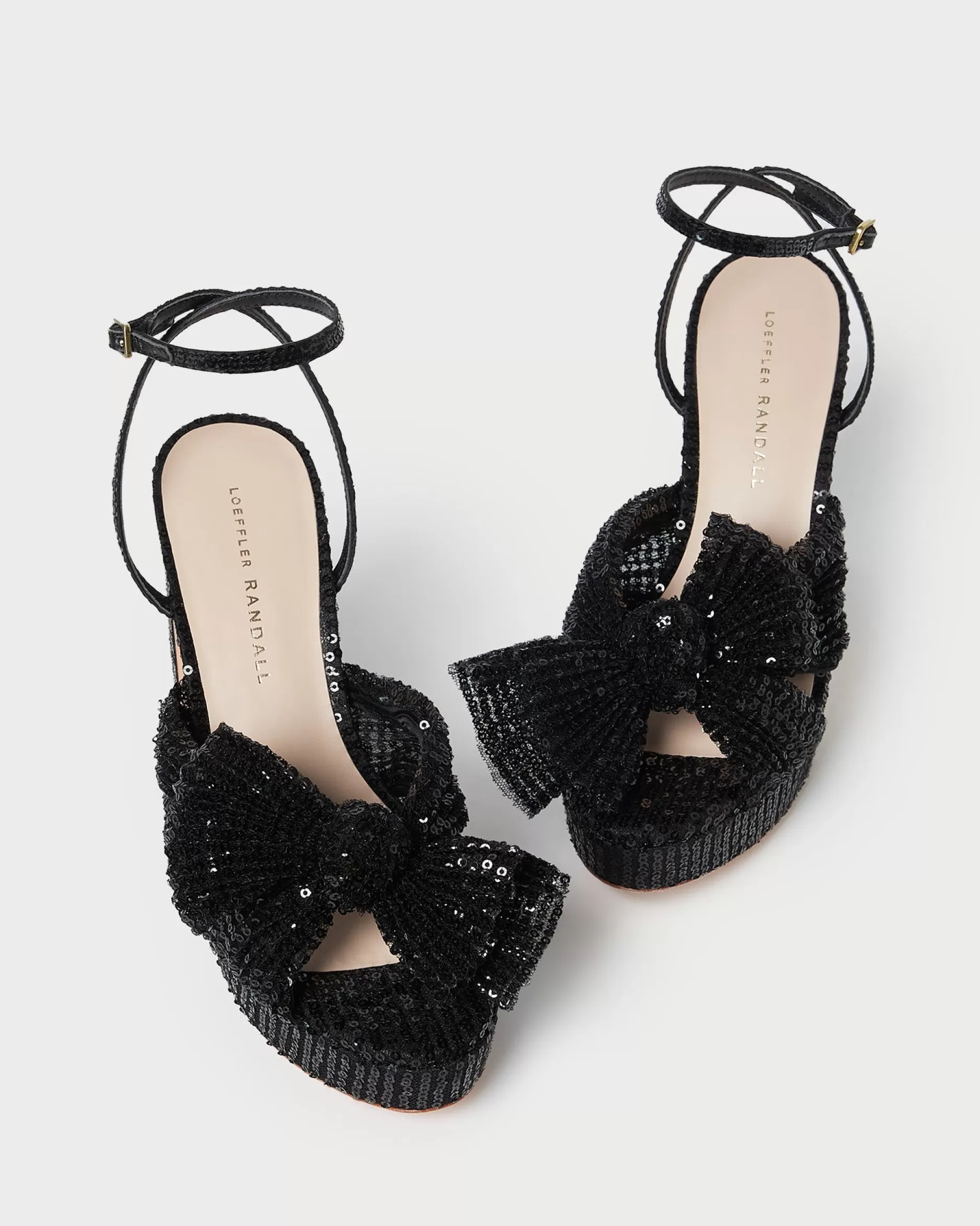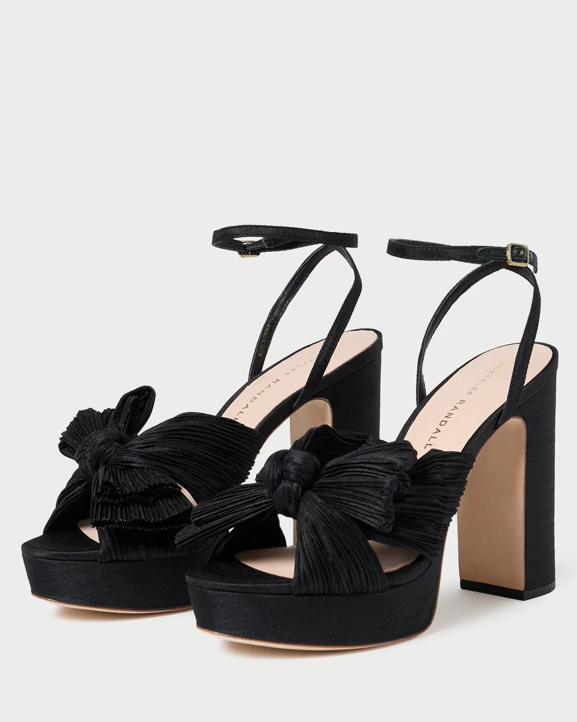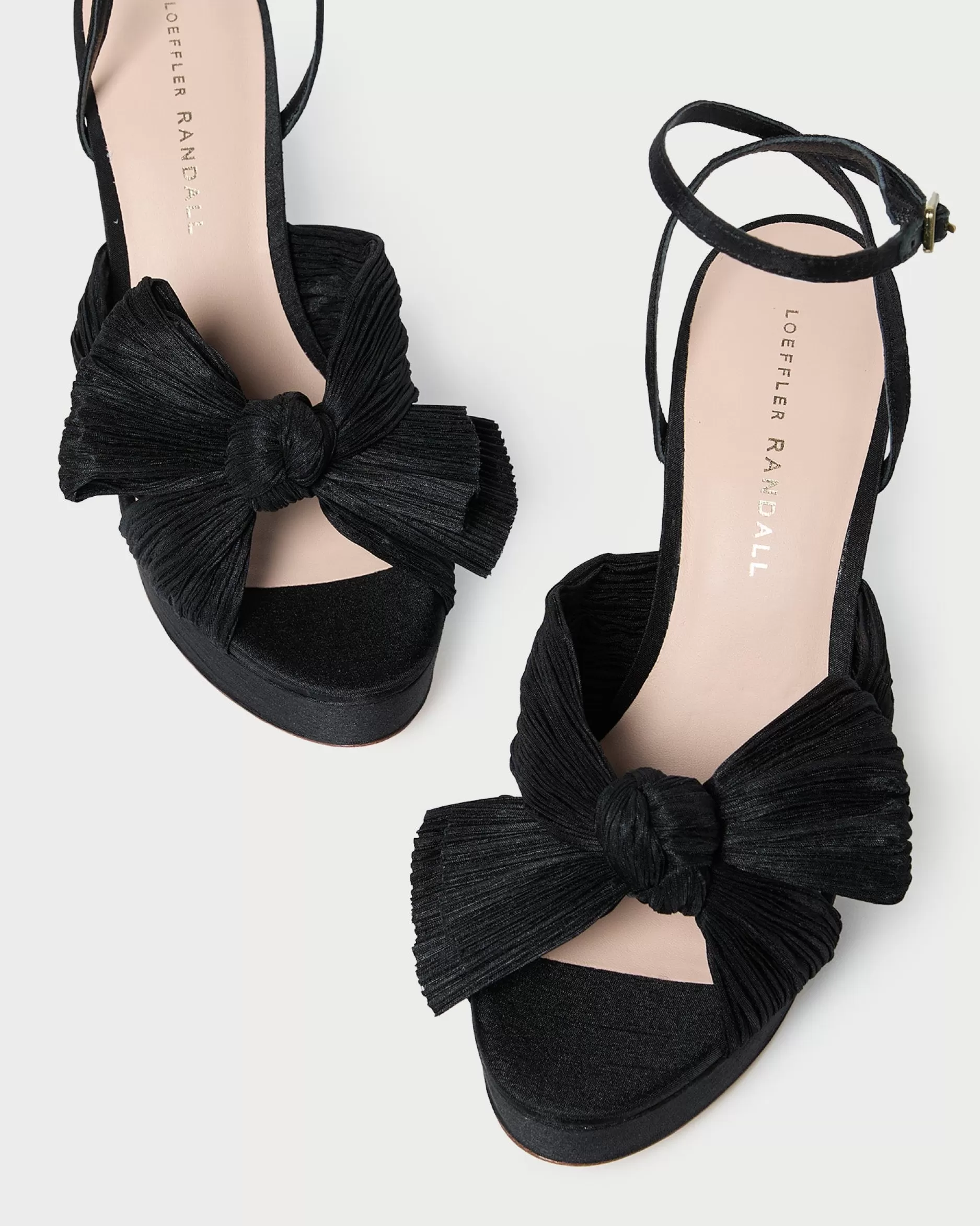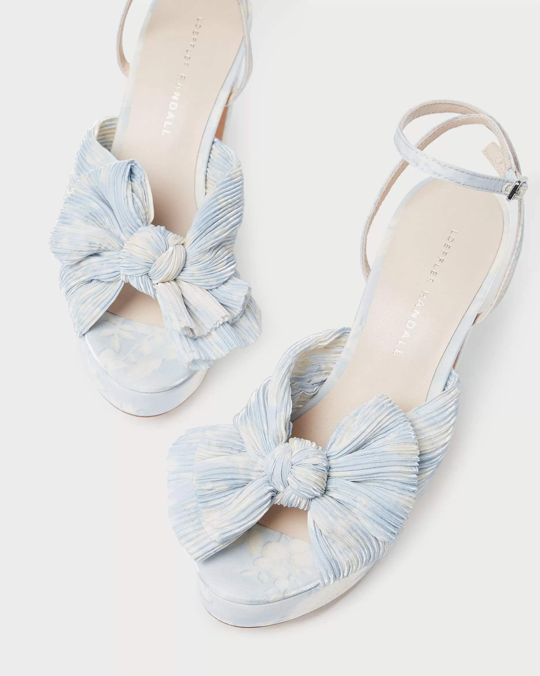 Welcome to Loeffler Randall. Discover our collection of beautiful, handcrafted styles from shoes to RTW to accessories. |Pleated, heeled platform sandal in white fabric covered with cream lace and topped with our signature knotted bow. Padded footbed with gold stamped logo. Open toe with adjustable buckle ankle strap. 4.5 inch heel, 1 inch platform.|Lace fabric is delicate. Store out of direct sunlight and avoid abrasive materials that may snag the fabric. The edges of the bow may fray over time with friction; they can be trimmed seasonally. |Pleated heeled platform sandal in black organza fabric topped with our signature knotted bow. Padded footbed with gold stamped logo. Open toe with adjustable buckle ankle strap. 4.5 inch heel, 1 inch platform.|Pleated fabric is delicate. Store out of direct sunlight and avoid abrasive materials that may snag the fabric. The edges of the fabric bow may fray over time with friction; they can be trimmed seasonally. Pleated fabric should not be stored in tight spaces to avoid crushing the pleating.|Pleated, heeled platform sandal in fabric covered in black sequins and topped with our signature knotted bow. Padded footbed with gold stamped logo. Open toe with adjustable buckle ankle strap. 4.5 inch heel, 1 inch platform.|u003cbr /u003ePleated fabric and sequins are both delicate. Store out of direct sunlight and avoid abrasive materials and rough surfaces that may snag the materials. Sequins may shed over time with wear.|u003cpu003ePleated heeled platform sandal in champagne-hued Italian lamé topped with our signature knotted bow. Padded footbed with gold stamped logo. Open toe with adjustable buckle ankle strap. 4.5-inch heel, 1-inch platform.u003c/pu003e|Pleated fabric is delicate. Store out of direct sunlight and avoid abrasive materials that may snag the fabric. The edges of the fabric bow may fray over time with friction; they can be trimmed seasonally. Pleated fabric should not be stored in tight spaces to avoid crushing the pleating.|Pleated heeled platform sandal in pearl organza fabric topped with our signature knotted bow. Padded raised footbed with gold stamped logo. Open toe with adjustable buckle ankle strap. 4.5 inch heel, 1 inch platform.|Pleated fabric is delicate. Store out of direct sunlight and avoid abrasive materials that may snag the fabric. The edges of the fabric bow may fray over time with friction; they can be trimmed seasonally. Pleated fabric should not be stored in tight spaces to avoid crushing the pleating.|Pleated heeled platform sandal in platinum fabric topped with our signature knotted bow. Padded footbed with gold stamped logo. Open toe with adjustable buckle ankle strap. 4.5 inch heel, 1 inch platform.|Pleated fabric is delicate. Store out of direct sunlight and avoid abrasive materials that may snag the fabric. The edges of the fabric bow may fray over time with friction; they can be trimmed seasonally. Pleated fabric should not be stored in tight spaces to avoid crushing the pleating.|Pleated heeled platform sandal in dusty blue high-shine floral fabric topped with our signature knotted bow. Features a padded leather footbed with gold stamped logo, an open toe, and an adjustable buckle ankle strap. 4.5-inch heel, 1-inch platform.|Pleated fabric is delicate. Store out of direct sunlight and avoid abrasive materials that may snag the fabric. The edges of the bow may fray over time with friction; they can be trimmed seasonally. Pleated fabric should not be stored in tight spaces to avoid crushing the pleating.|Pleated, heeled platform sandal in white fabric covered with cream lace and topped with our signature knotted bow. Padded footbed with gold stamped logo. Open toe with adjustable buckle ankle strap. 4.5 inch heel, 1 inch platform.