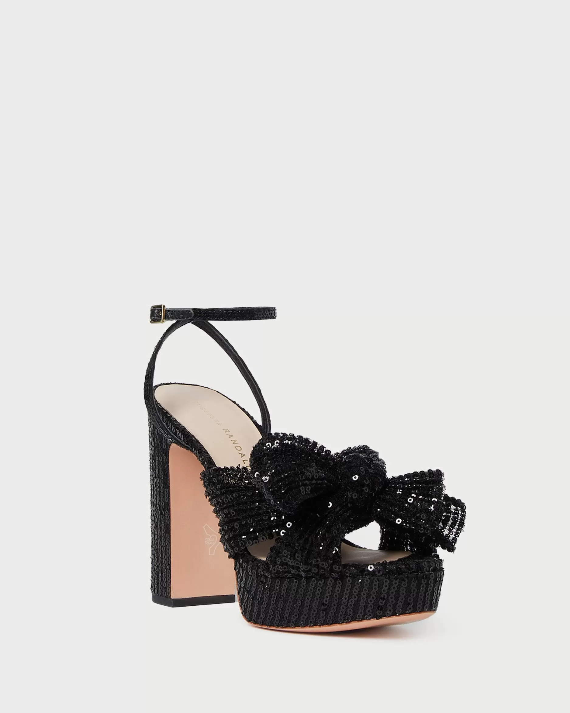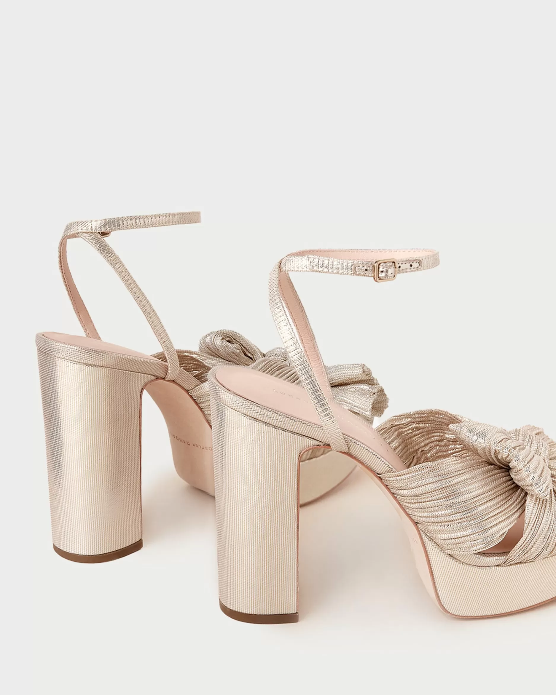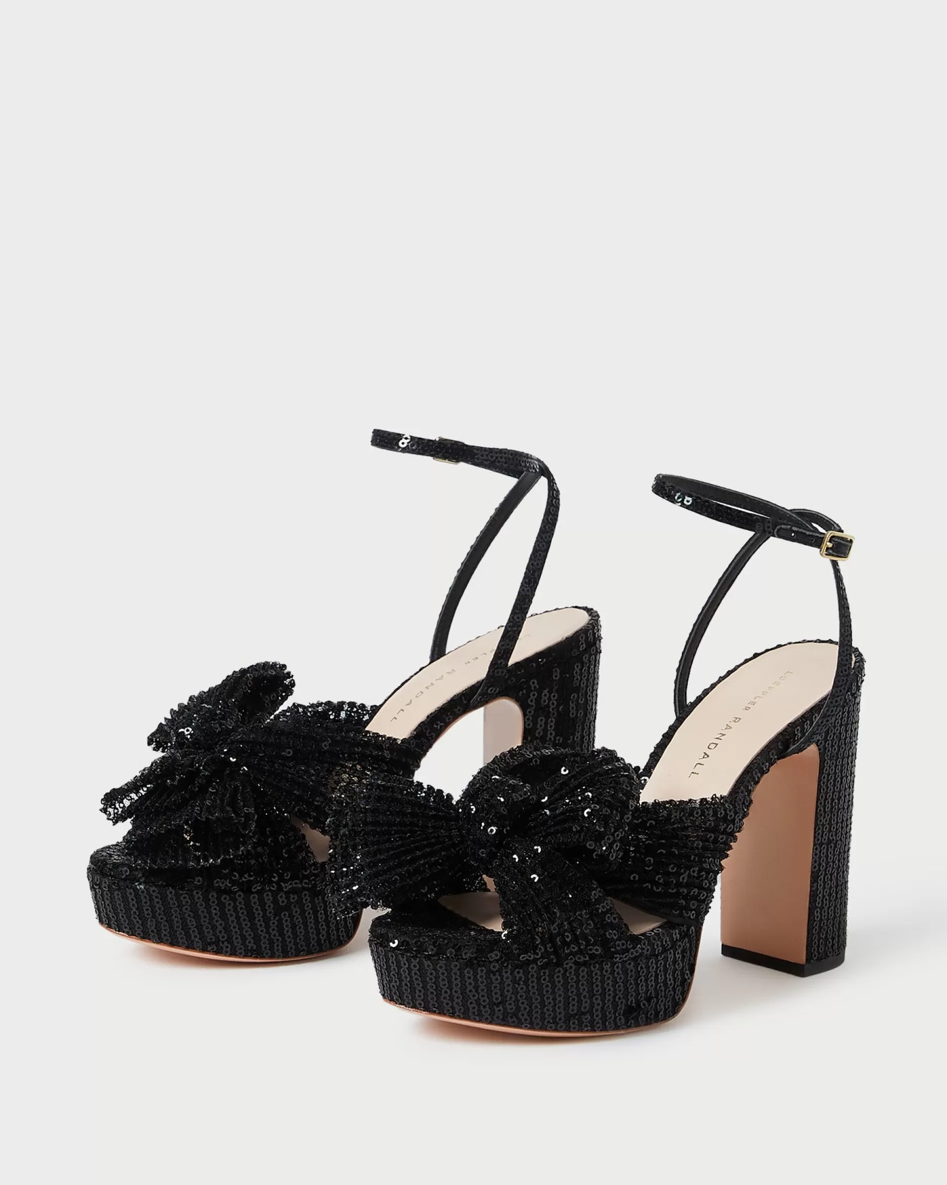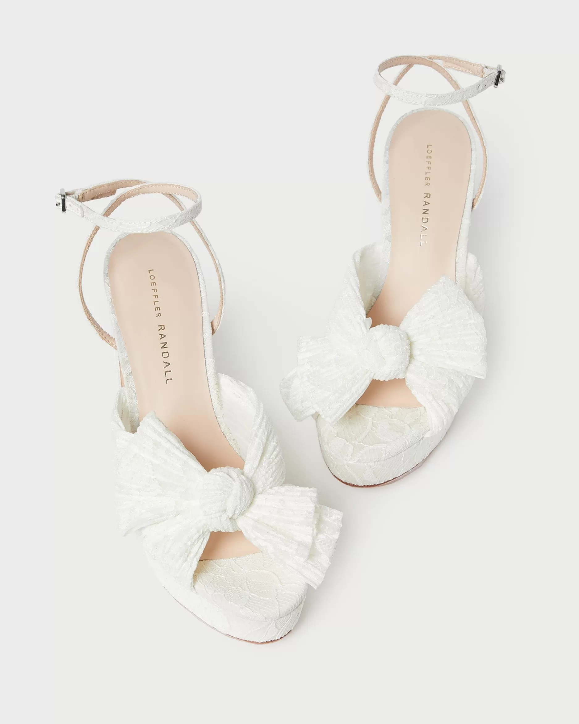 Welcome to Loeffler Randall. Discover our collection of beautiful, handcrafted styles from shoes to RTW to accessories. |Pleated, heeled platform sandal in white fabric covered with cream lace and topped with our signature knotted bow. Padded footbed with gold stamped logo. Open toe with adjustable buckle ankle strap. 4.5 inch heel, 1 inch platform.|Lace fabric is delicate. Store out of direct sunlight and avoid abrasive materials that may snag the fabric. The edges of the bow may fray over time with friction; they can be trimmed seasonally. |Pleated heeled platform sandal in black organza fabric topped with our signature knotted bow. Padded footbed with gold stamped logo. Open toe with adjustable buckle ankle strap. 4.5 inch heel, 1 inch platform.|Pleated fabric is delicate. Store out of direct sunlight and avoid abrasive materials that may snag the fabric. The edges of the fabric bow may fray over time with friction; they can be trimmed seasonally. Pleated fabric should not be stored in tight spaces to avoid crushing the pleating.|Pleated, heeled platform sandal in fabric covered in black sequins and topped with our signature knotted bow. Padded footbed with gold stamped logo. Open toe with adjustable buckle ankle strap. 4.5 inch heel, 1 inch platform.|u003cbr /u003ePleated fabric and sequins are both delicate. Store out of direct sunlight and avoid abrasive materials and rough surfaces that may snag the materials. Sequins may shed over time with wear.|u003cpu003ePleated heeled platform sandal in champagne-hued Italian lamé topped with our signature knotted bow. Padded footbed with gold stamped logo. Open toe with adjustable buckle ankle strap. 4.5-inch heel, 1-inch platform.u003c/pu003e|Pleated fabric is delicate. Store out of direct sunlight and avoid abrasive materials that may snag the fabric. The edges of the fabric bow may fray over time with friction; they can be trimmed seasonally. Pleated fabric should not be stored in tight spaces to avoid crushing the pleating.|Pleated heeled platform sandal in pearl organza fabric topped with our signature knotted bow. Padded raised footbed with gold stamped logo. Open toe with adjustable buckle ankle strap. 4.5 inch heel, 1 inch platform.|Pleated fabric is delicate. Store out of direct sunlight and avoid abrasive materials that may snag the fabric. The edges of the fabric bow may fray over time with friction; they can be trimmed seasonally. Pleated fabric should not be stored in tight spaces to avoid crushing the pleating.|Pleated heeled platform sandal in platinum fabric topped with our signature knotted bow. Padded footbed with gold stamped logo. Open toe with adjustable buckle ankle strap. 4.5 inch heel, 1 inch platform.|Pleated fabric is delicate. Store out of direct sunlight and avoid abrasive materials that may snag the fabric. The edges of the fabric bow may fray over time with friction; they can be trimmed seasonally. Pleated fabric should not be stored in tight spaces to avoid crushing the pleating.|Pleated heeled platform sandal in dusty blue high-shine floral fabric topped with our signature knotted bow. Features a padded leather footbed with gold stamped logo, an open toe, and an adjustable buckle ankle strap. 4.5-inch heel, 1-inch platform.|Pleated fabric is delicate. Store out of direct sunlight and avoid abrasive materials that may snag the fabric. The edges of the bow may fray over time with friction; they can be trimmed seasonally. Pleated fabric should not be stored in tight spaces to avoid crushing the pleating.|Pleated, heeled platform sandal in white fabric covered with cream lace and topped with our signature knotted bow. Padded footbed with gold stamped logo. Open toe with adjustable buckle ankle strap. 4.5 inch heel, 1 inch platform.
