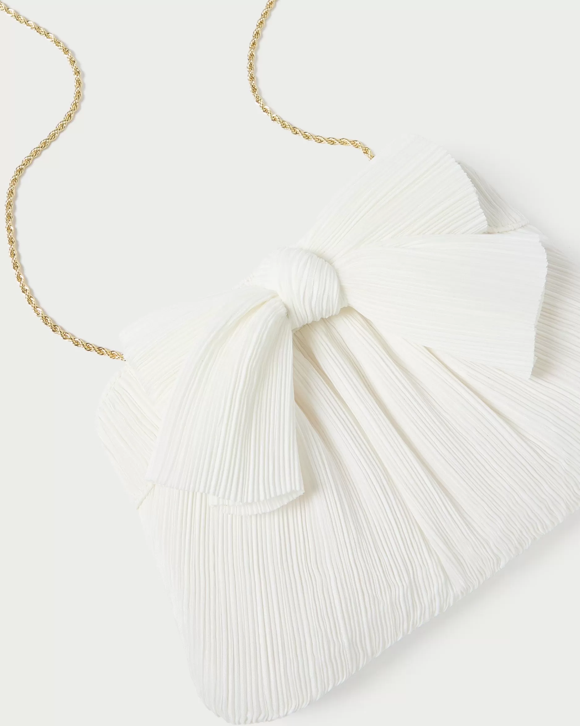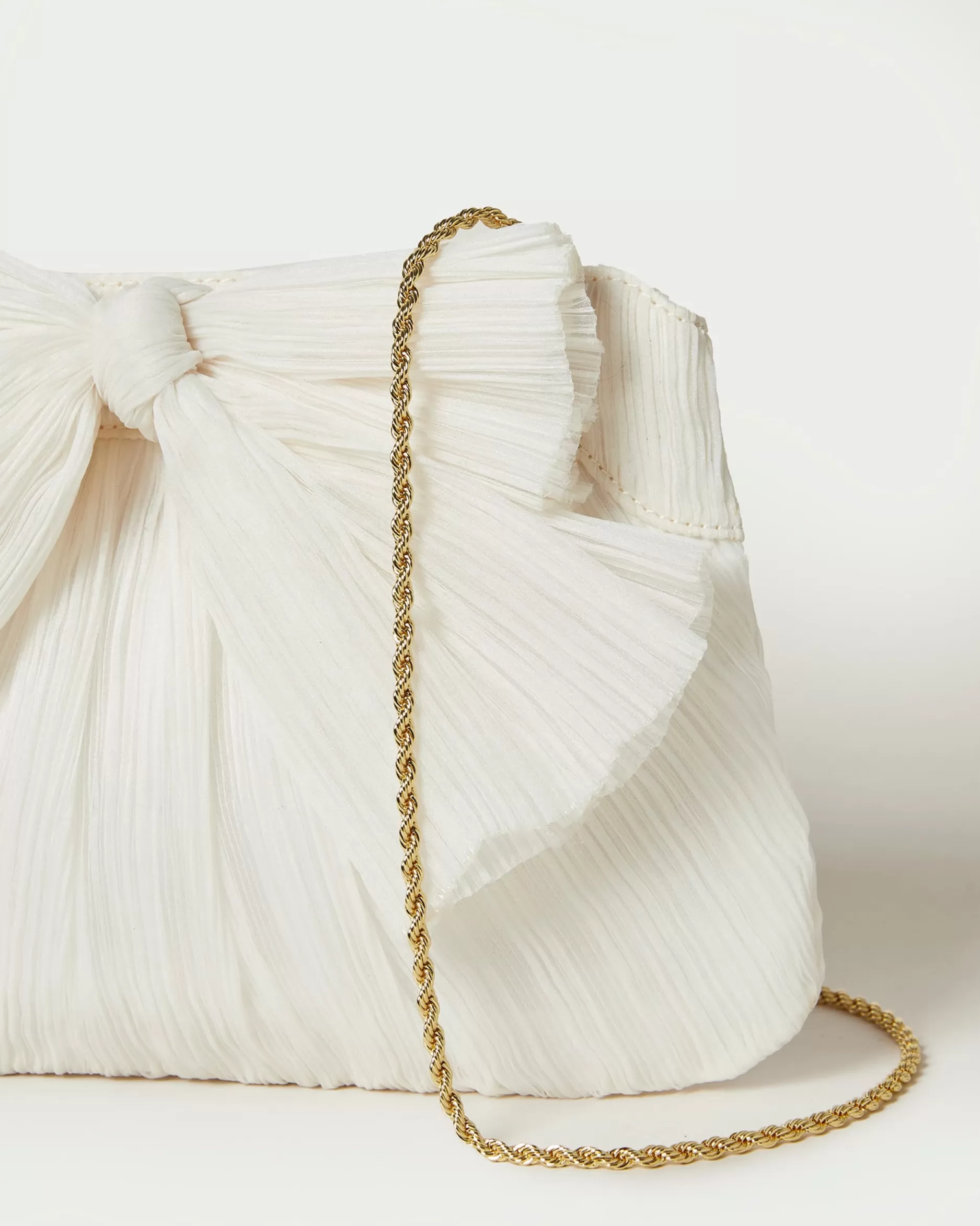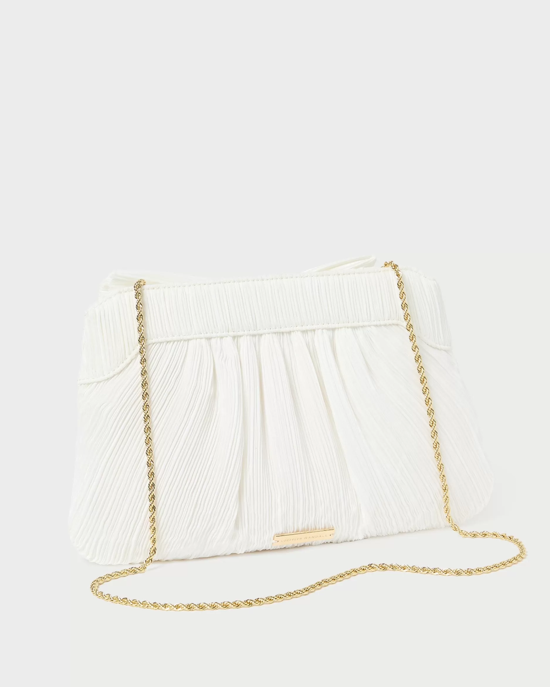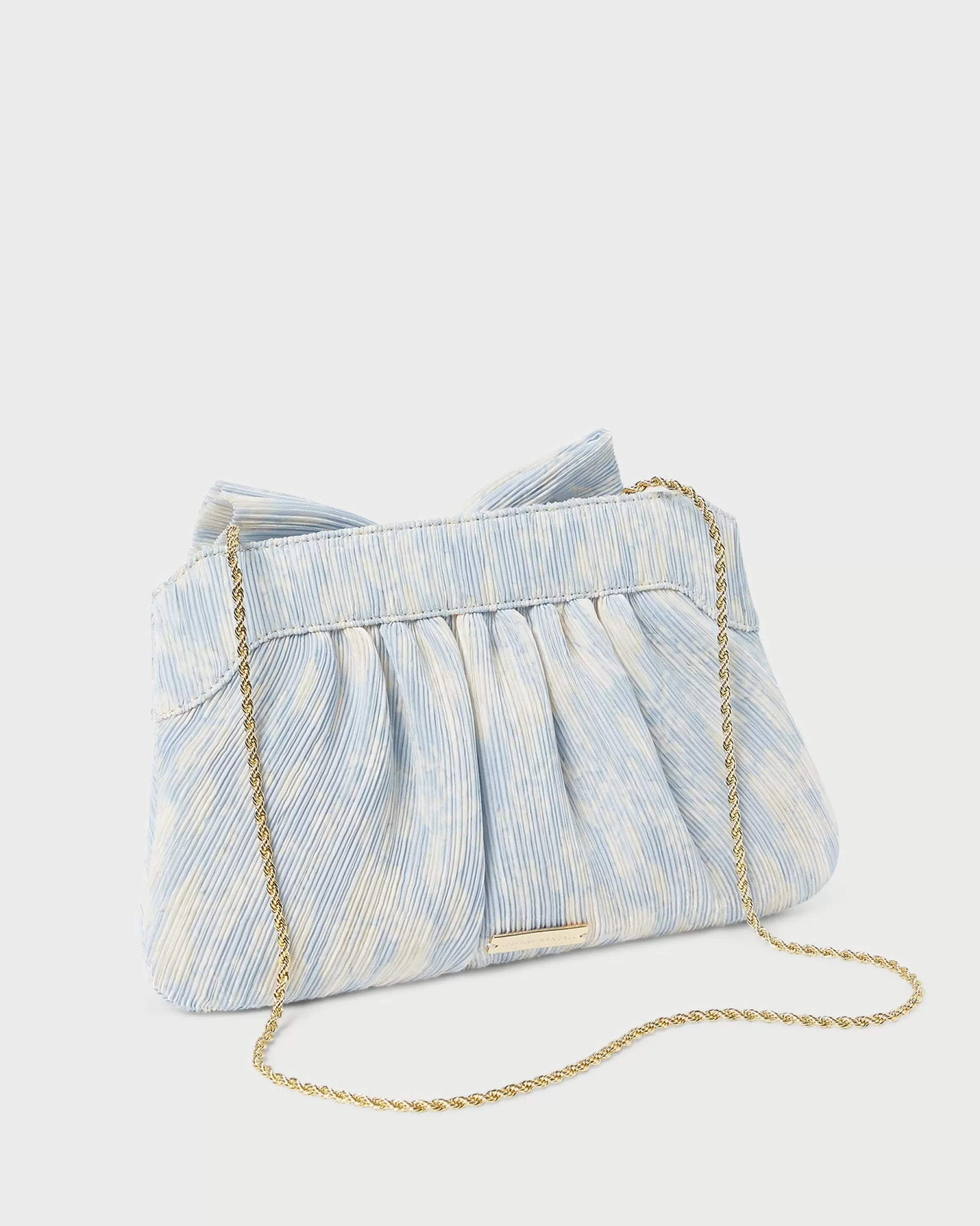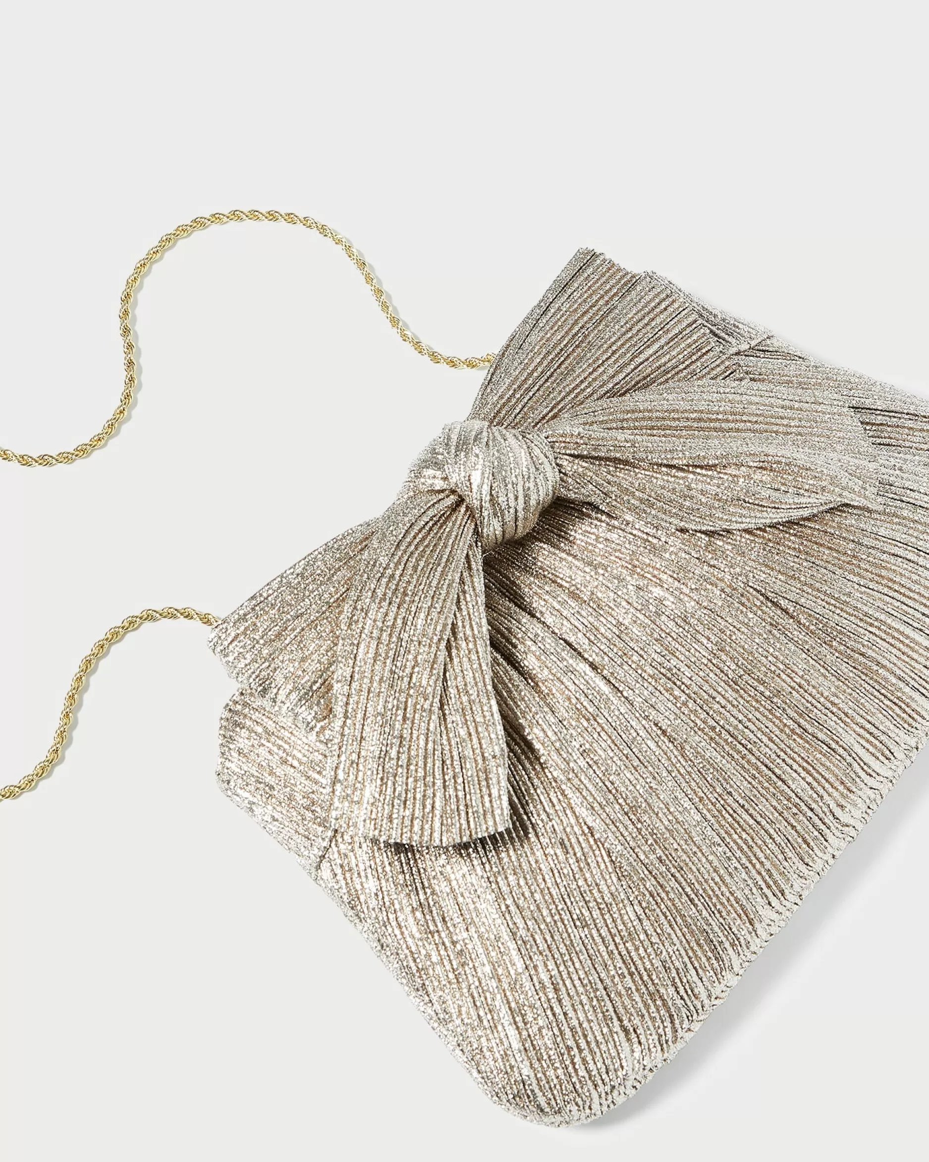 Welcome to Loeffler Randall. Discover our collection of beautiful, handcrafted styles from shoes to RTW to accessories. |Pleated frame clutch in bright white shantung topped with our signature knotted bow. Features a removable twisted gold chain crossbody strap, frame closure, full lining, and gold stamped logo.|Pleated fabric is delicate. Store out of direct sunlight and avoid abrasive materials that may snag the fabric. The edges of the bow may fray over time with friction; they can be trimmed seasonally. Pleated fabric should not be stored in tight spaces to avoid crushing the pleating.|Pleated frame clutch in black organza fabric topped with our signature knotted bow. Features a removable twisted gold chain crossbody strap, frame closure, full lining, and gold stamped logo.|Pleated fabric is delicate. Store out of direct sunlight and avoid abrasive materials that may snag the fabric. The edges of the fabric bow may fray over time with friction; they can be trimmed seasonally. Pleated fabric should not be stored in tight spaces to avoid crushing the pleating.|Pleated frame clutch in dusty blue watercolor floral topped with our signature knotted bow. Features a removable twisted gold chain crossbody strap, frame closure, full lining, and gold stamped logo.|Pleated fabric is delicate. Store out of direct sunlight and avoid abrasive materials that may snag the fabric. The edges of the bow may fray over time with friction; they can be trimmed seasonally. Pleated fabric should not be stored in tight spaces to avoid crushing the pleating.|u003cpu003ePleated frame clutch in champagne-hued Italian lamé topped with our signature knotted bow. Features a removable twisted gold chain crossbody strap, frame closure, full lining, and gold stamped logo.u003c/pu003e|Pleated fabric is delicate. Store out of direct sunlight and avoid abrasive materials that may snag the fabric. Avoid storing in tight spaces, which could crush the pleating.|Pleated frame clutch in natural straw topped with our signature knotted bow. Features a removable twisted gold chain crossbody strap, frame closure, full lining, and gold stamped logo.|We selected this material for its exceptional quality and appearance. As with most natural materials, variations in thickness and color are to be expected. Due to the delicate nature of the fiber, normal wear may occur over time. It is recommended that raffia not be exposed to water in order to maintain its appearance.|Pleated frame clutch in ivory pearl fabric topped with our signature knotted bow. Features a removable twisted gold chain crossbody strap, frame closure, full lining, and gold stamped logo.|Pleated fabric is delicate. Store out of direct sunlight and avoid abrasive materials that may snag the fabric. Edges of fabric bow may fray over time with friction; they can be trimmed seasonally. Pleated fabric should not be stored in tight spaces to avoid crushing the pleating.|Pleated frame clutch in platinum metallic lamé topped with our signature knotted bow. Features both gold and silver tones, a removable twisted gold chain crossbody strap, frame closure, full lining, and gold stamped logo.|Pleated fabric is delicate. Store out of direct sunlight and avoid abrasive materials that may snag the fabric. Edges of fabric bow may fray over time with friction; they can be trimmed seasonally. Pleated fabric should not be stored in tight spaces to avoid crushing the pleating.|Pleated frame clutch in sage green fabric topped with our signature knotted bow. Features a removable twisted gold chain crossbody strap, frame closure, full lining, and gold stamped logo. |Pleated fabric is delicate. Store out of direct sunlight and avoid abrasive materials that may snag the fabric. Edges of fabric bow may fray over time with friction; they can be trimmed seasonally. Pleated fabric should not be stored in tight spaces to avoid crushing the pleating.|Pleated frame clutch in white fabric covered with cream lace and topped with our signature knotted bow. Features a removable twisted gold chain crossbody strap, frame closure, full lining, and gold stamped logo.|Pleated fabric and lace are both delicate. Store out of direct sunlight and avoid abrasive materials and rough surfaces that may snag the materials. avoid storing in tight spaces to prevent the pleating from being crushed. Lace may fray over time with wear.|Pleated frame clutch in brown gingham fabric topped with our signature knotted bow. Features a removable twisted gold chain crossbody strap, frame closure, full lining, and gold stamped logo.|Pleated fabric is delicate. Store out of direct sunlight and avoid abrasive materials that may snag the fabric. The edges of the bow may fray over time with friction; they can be trimmed seasonally. Pleated fabric should not be stored in tight spaces to avoid crushing the pleating.|u003cpu003ePleated frame clutch with bow in gold pleated u003cspanu003elaméu003c/spanu003e. Fully lined with removable twisted gold metal chain strap.u003c/pu003e|Pleated fabric is delicate. Store out of direct sunlight and avoid abrasive materials that may snag the fabric. Edges of fabric bow may fray over time with friction; they can be trimmed seasonally. Pleated fabric should not be stored in tight spaces to avoid crushing the pleating.|Pleated frame clutch in bright white shantung topped with our signature knotted bow. Features a removable twisted gold chain crossbody strap, frame closure, full lining, and gold stamped logo.
