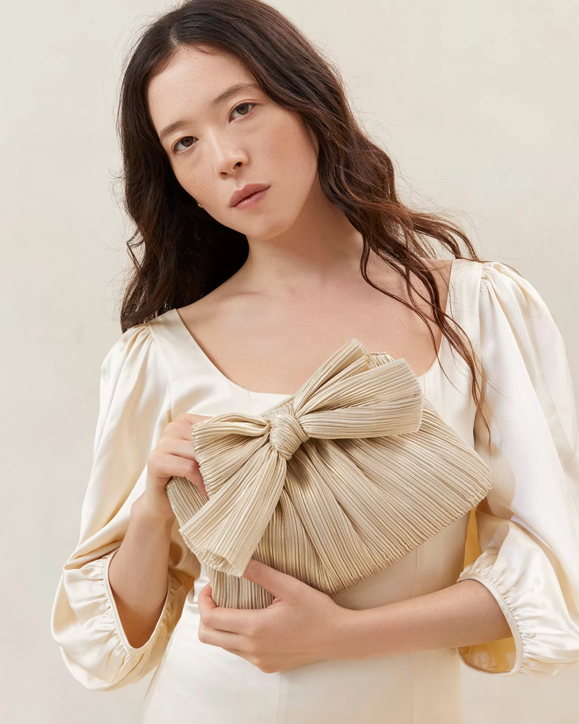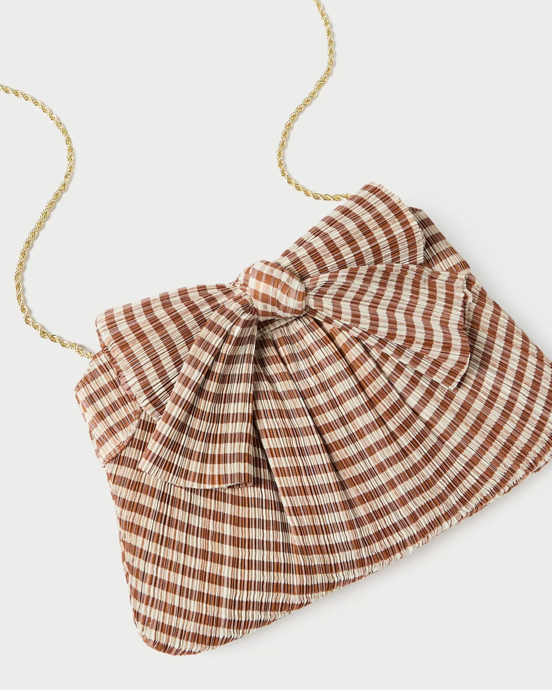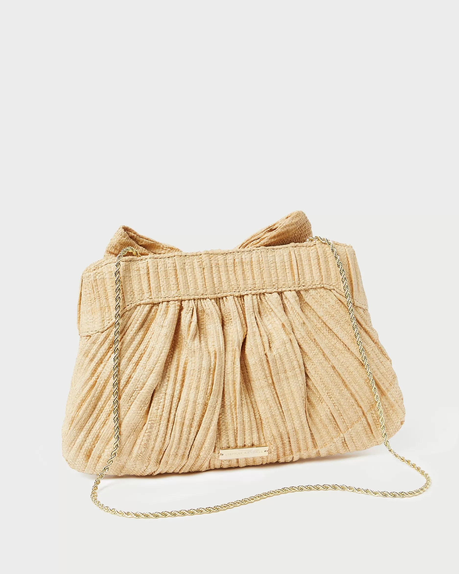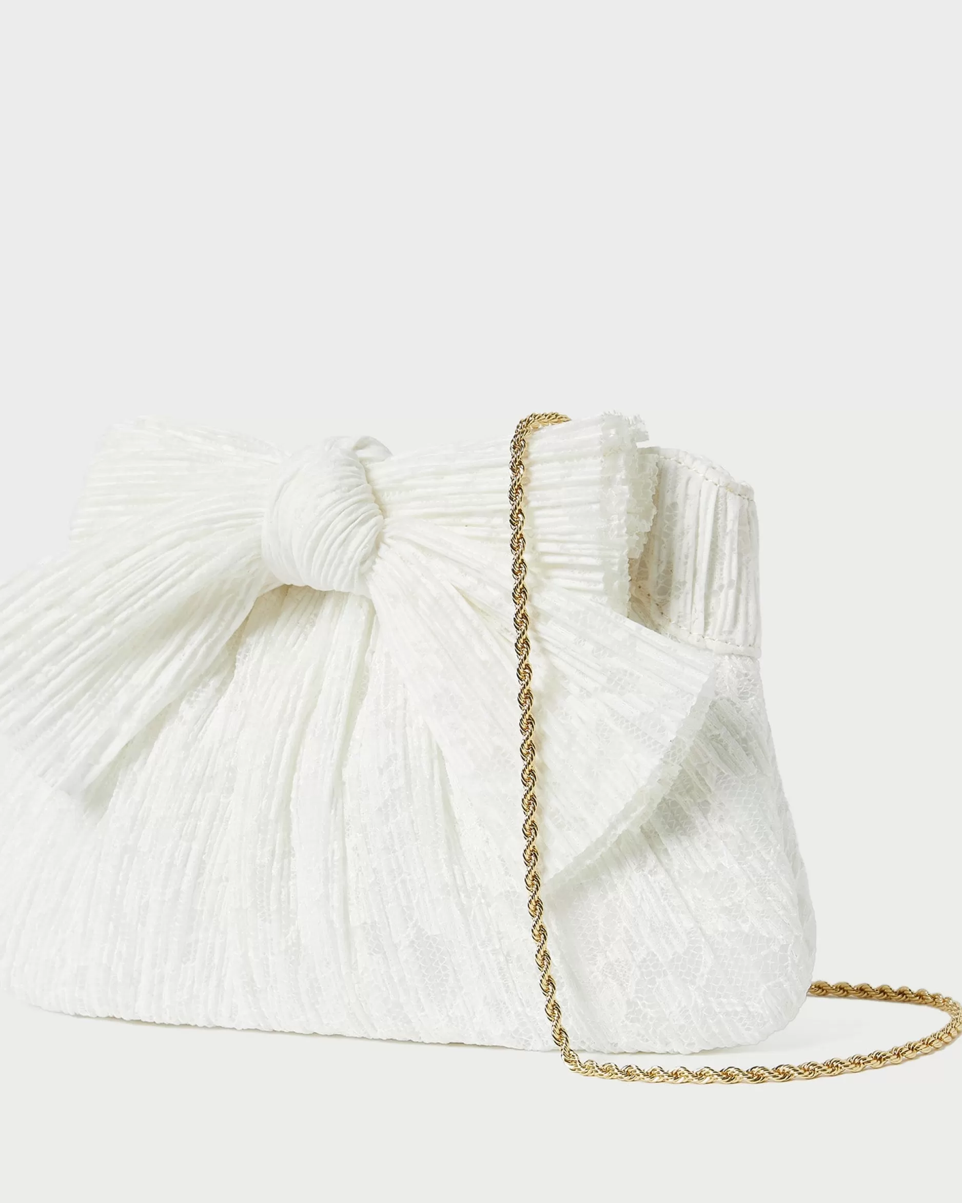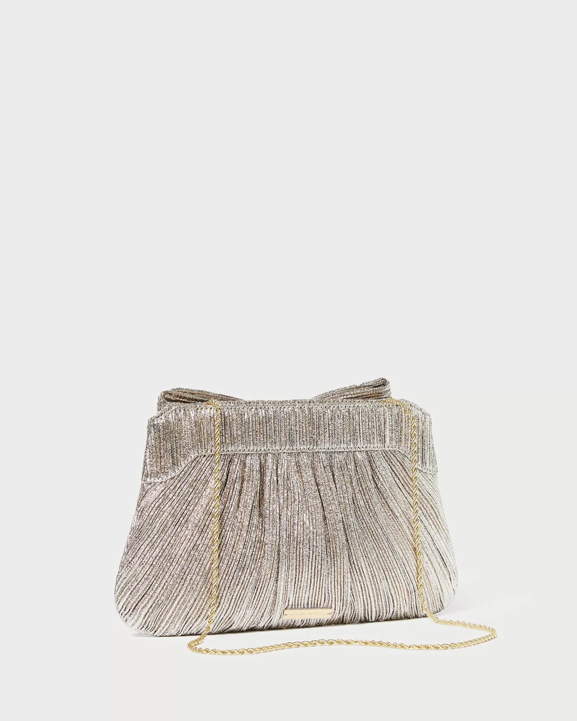 Welcome to Loeffler Randall. Discover our collection of beautiful, handcrafted styles from shoes to RTW to accessories. |Pleated frame clutch in bright white shantung topped with our signature knotted bow. Features a removable twisted gold chain crossbody strap, frame closure, full lining, and gold stamped logo.|Pleated fabric is delicate. Store out of direct sunlight and avoid abrasive materials that may snag the fabric. The edges of the bow may fray over time with friction; they can be trimmed seasonally. Pleated fabric should not be stored in tight spaces to avoid crushing the pleating.|Pleated frame clutch in black organza fabric topped with our signature knotted bow. Features a removable twisted gold chain crossbody strap, frame closure, full lining, and gold stamped logo.|Pleated fabric is delicate. Store out of direct sunlight and avoid abrasive materials that may snag the fabric. The edges of the fabric bow may fray over time with friction; they can be trimmed seasonally. Pleated fabric should not be stored in tight spaces to avoid crushing the pleating.|Pleated frame clutch in dusty blue watercolor floral topped with our signature knotted bow. Features a removable twisted gold chain crossbody strap, frame closure, full lining, and gold stamped logo.|Pleated fabric is delicate. Store out of direct sunlight and avoid abrasive materials that may snag the fabric. The edges of the bow may fray over time with friction; they can be trimmed seasonally. Pleated fabric should not be stored in tight spaces to avoid crushing the pleating.|u003cpu003ePleated frame clutch in champagne-hued Italian lamé topped with our signature knotted bow. Features a removable twisted gold chain crossbody strap, frame closure, full lining, and gold stamped logo.u003c/pu003e|Pleated fabric is delicate. Store out of direct sunlight and avoid abrasive materials that may snag the fabric. Avoid storing in tight spaces, which could crush the pleating.|Pleated frame clutch in natural straw topped with our signature knotted bow. Features a removable twisted gold chain crossbody strap, frame closure, full lining, and gold stamped logo.|We selected this material for its exceptional quality and appearance. As with most natural materials, variations in thickness and color are to be expected. Due to the delicate nature of the fiber, normal wear may occur over time. It is recommended that raffia not be exposed to water in order to maintain its appearance.|Pleated frame clutch in ivory pearl fabric topped with our signature knotted bow. Features a removable twisted gold chain crossbody strap, frame closure, full lining, and gold stamped logo.|Pleated fabric is delicate. Store out of direct sunlight and avoid abrasive materials that may snag the fabric. Edges of fabric bow may fray over time with friction; they can be trimmed seasonally. Pleated fabric should not be stored in tight spaces to avoid crushing the pleating.|Pleated frame clutch in platinum metallic lamé topped with our signature knotted bow. Features both gold and silver tones, a removable twisted gold chain crossbody strap, frame closure, full lining, and gold stamped logo.|Pleated fabric is delicate. Store out of direct sunlight and avoid abrasive materials that may snag the fabric. Edges of fabric bow may fray over time with friction; they can be trimmed seasonally. Pleated fabric should not be stored in tight spaces to avoid crushing the pleating.|Pleated frame clutch in sage green fabric topped with our signature knotted bow. Features a removable twisted gold chain crossbody strap, frame closure, full lining, and gold stamped logo. |Pleated fabric is delicate. Store out of direct sunlight and avoid abrasive materials that may snag the fabric. Edges of fabric bow may fray over time with friction; they can be trimmed seasonally. Pleated fabric should not be stored in tight spaces to avoid crushing the pleating.|Pleated frame clutch in white fabric covered with cream lace and topped with our signature knotted bow. Features a removable twisted gold chain crossbody strap, frame closure, full lining, and gold stamped logo.|Pleated fabric and lace are both delicate. Store out of direct sunlight and avoid abrasive materials and rough surfaces that may snag the materials. avoid storing in tight spaces to prevent the pleating from being crushed. Lace may fray over time with wear.|Pleated frame clutch in brown gingham fabric topped with our signature knotted bow. Features a removable twisted gold chain crossbody strap, frame closure, full lining, and gold stamped logo.|Pleated fabric is delicate. Store out of direct sunlight and avoid abrasive materials that may snag the fabric. The edges of the bow may fray over time with friction; they can be trimmed seasonally. Pleated fabric should not be stored in tight spaces to avoid crushing the pleating.|u003cpu003ePleated frame clutch with bow in gold pleated u003cspanu003elaméu003c/spanu003e. Fully lined with removable twisted gold metal chain strap.u003c/pu003e|Pleated fabric is delicate. Store out of direct sunlight and avoid abrasive materials that may snag the fabric. Edges of fabric bow may fray over time with friction; they can be trimmed seasonally. Pleated fabric should not be stored in tight spaces to avoid crushing the pleating.|Pleated frame clutch in bright white shantung topped with our signature knotted bow. Features a removable twisted gold chain crossbody strap, frame closure, full lining, and gold stamped logo.