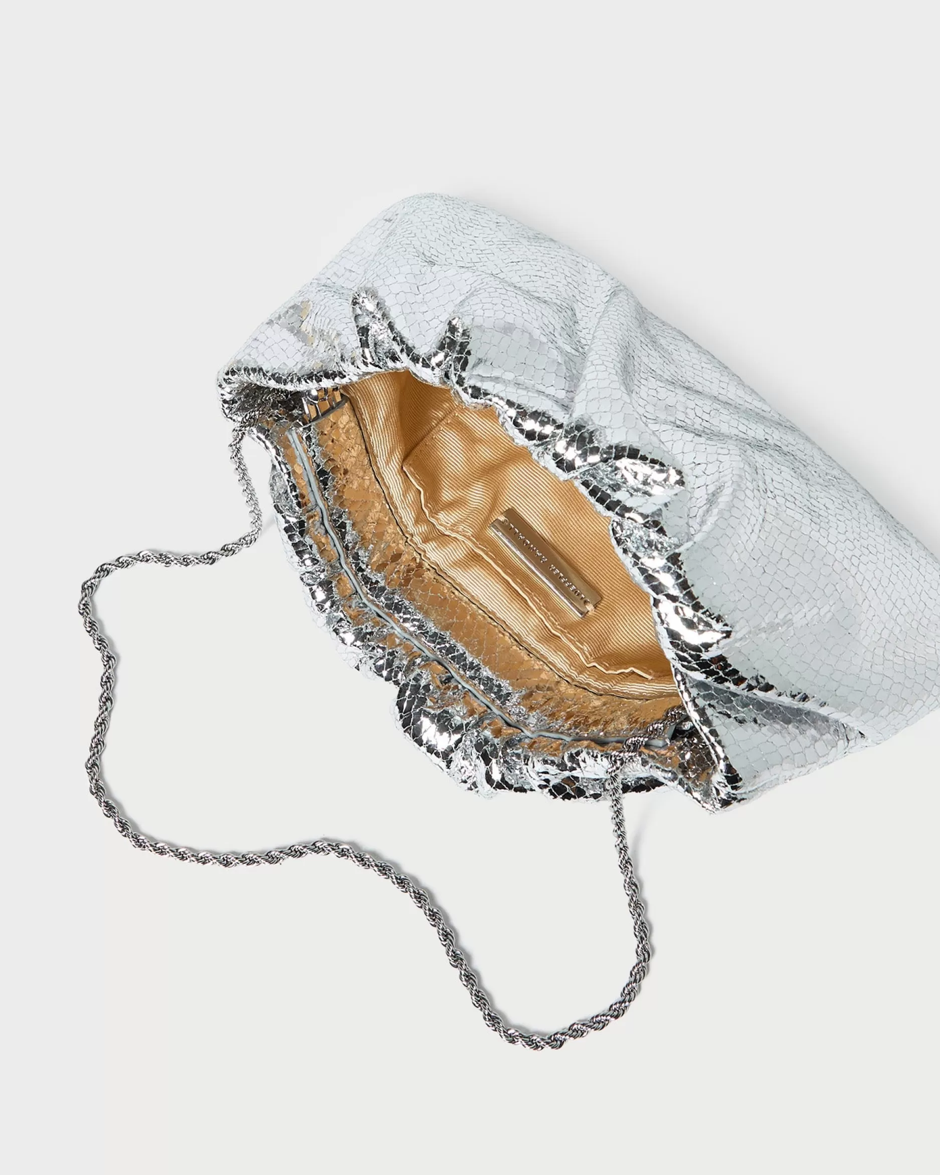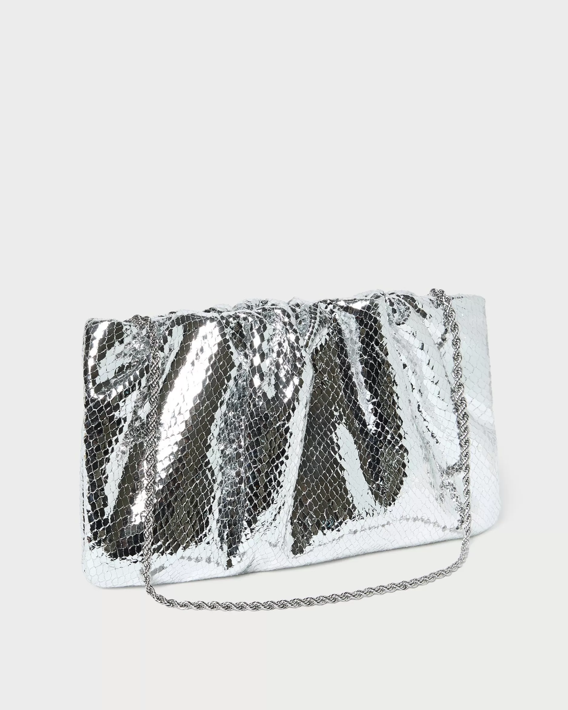 Welcome to Loeffler Randall. Discover our collection of beautiful, handcrafted styles from shoes to RTW to accessories. |Gathered flat clutch in silver snake embossed leather. Features a removable metal chain strap, frame closure, full lining, and an interior metal logo plaque.|Keep away from water and avoid prolonged exposure to sunlight. Use a leather conditioner to maintain appearance.|Gathered flat clutch in silver snake embossed leather. Features a removable metal chain strap, frame closure, full lining, and an interior metal logo plaque.