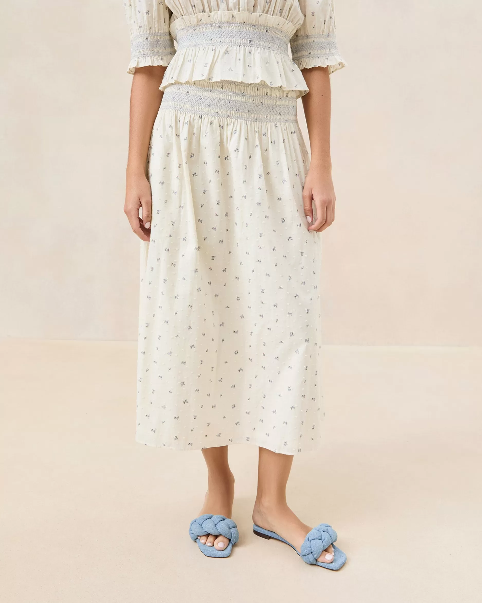 Welcome to Loeffler Randall. Discover our collection of beautiful, handcrafted styles from shoes to RTW to accessories. |Midi-length skirt in cream mini floral swiss dot–printed cotton. Features smocking at the waist. Pairs beautifully with the matching Nicola top.|Dry clean only.|Midi-length skirt in red, cream, and green multicolor floral-printed cotton. Features smocking at the waist. Pairs beautifully with the matching Nicola top.|Dry clean only.|Midi-length skirt in cream mini floral swiss dot–printed cotton. Features smocking at the waist. Pairs beautifully with the matching Nicola top.SizeXSSMLXLLength34.5"35"35.5"36.5"37.5"Waist21"23"25"27"29"